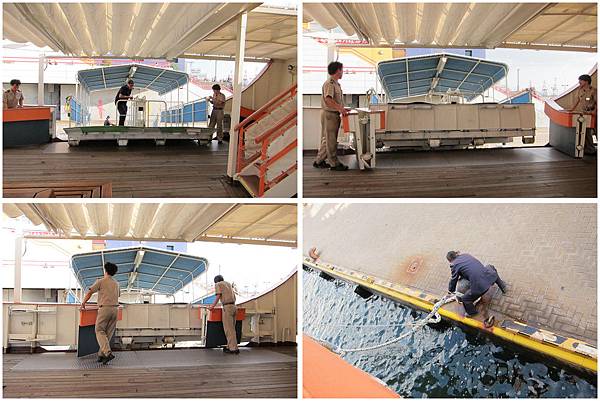 船上的工作人員正準備將接駁台收起 關上船門 收線啦